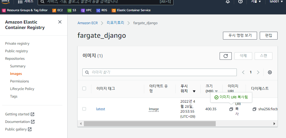 이미지는 ECR 리포지토리에 있는 이미지 URI를 복붙한다.