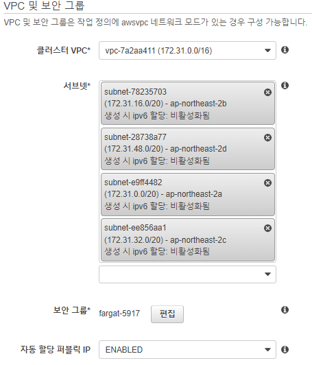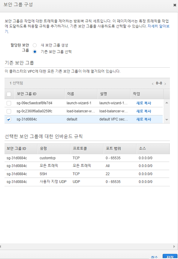 보안 그룹은 편집을 해서 default 보안 그룹을 선택했다.