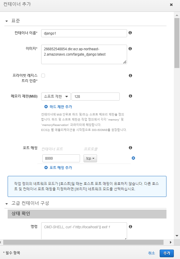 컨테이너 추가의 나머지 설정들은 건들이지 않아도 된다.