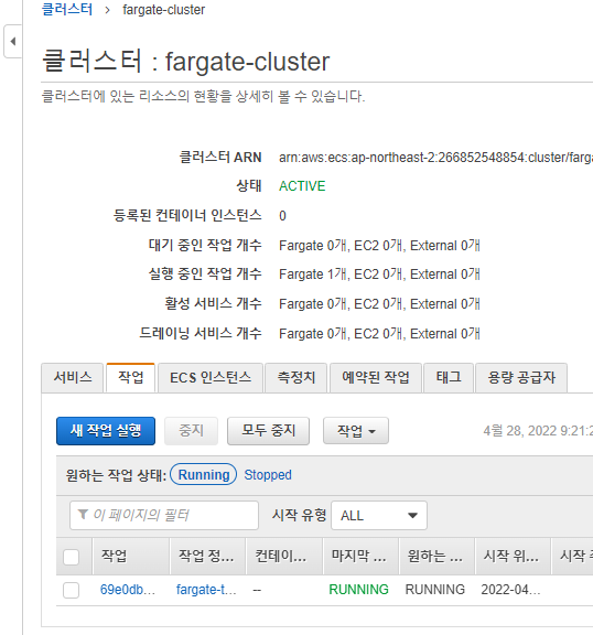 작업 탭에서 작업을 누르면 작업이 실행중인걸 볼 수 있다.