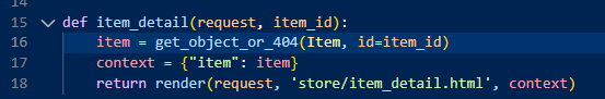 get_object_or_404 메서드를 이용해서 아이템의 아이디가 존재할 때는 데이터객체를 가져오고 그렇지 않을 떄는 http404에러를 일으킨다.