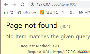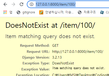 이번에는 http://127.0.0.1:8000/item/100/ 처럼 존재하지 않는 물품의 아이디의 url에 접근하려 했을 때 404에러를 일으켜보자