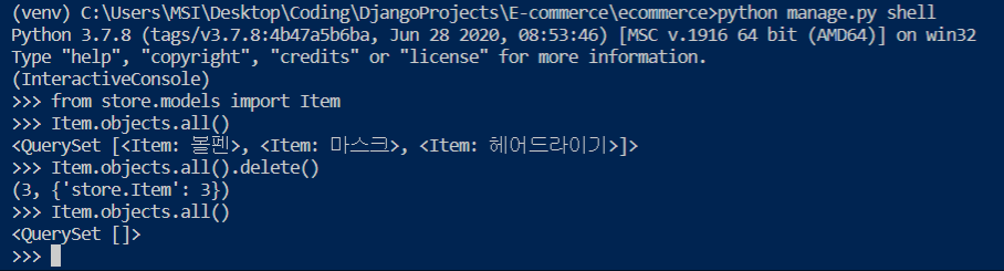 Item.objects.all().delete() 으로 모든 게시물을 삭제한다.