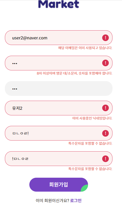 그리고 회원가입란에 유효성 검사가 잘 작동하는걸 볼 수 있다.