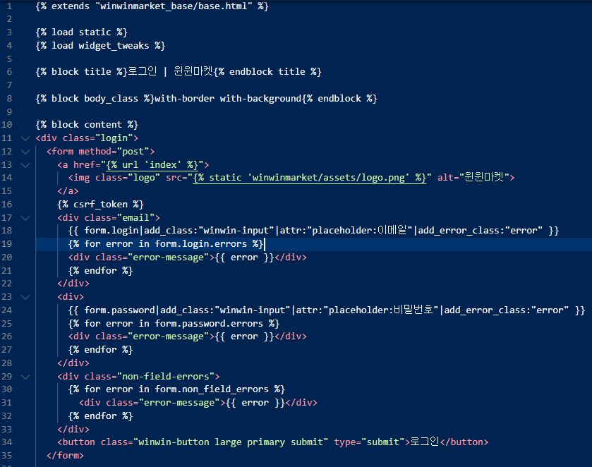 widget tweaks를 사용하기 위해 로드하고 input태그 대신에 form를 이용해서 유저가 입력한 정보를 받도록 한다.
