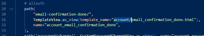 email_confirmation_done.html 파일 또한 account 폴더 안에 있는 것을 사용할 것이므로 프로젝트 폴더 안의 urls.py에서
