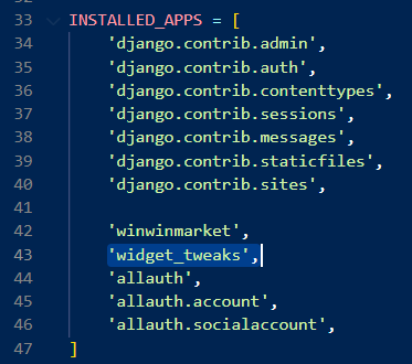그리고 settings.py에 가서 INSTALLED_APPS에 widget_tweaks를 추가한다.