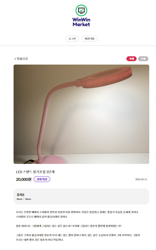 상세 페이지에는 물품 사진, 게시글 제목, 물품 가격, 물품 상태, 게시글 작성일, 작성자 정보 (나중에 작성자 정보 박스를 클릭하면 작성자의 프로필로 이동한다), 그리고 물품에 대한 상세 설명이 있다.