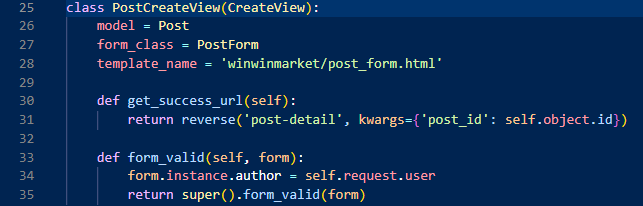 게시글의 author 필드를 자동으로 설정해 주는 방법은 form_valid 메서드를 오버라이딩하는 것이다.