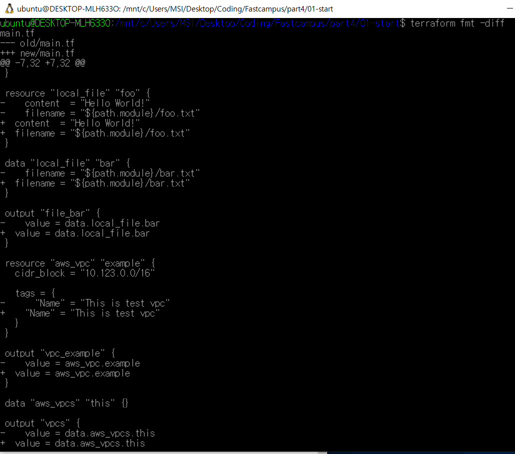 이는 terraform fmt -diff 명령어로 수정된 부분이 출력하고 코드 스타일을 자동으로 변경할 수 있다.