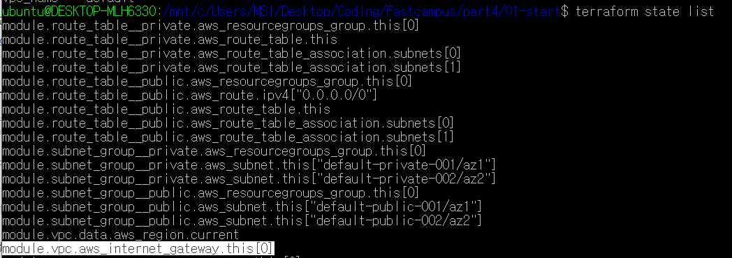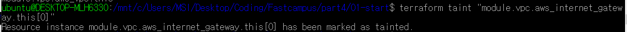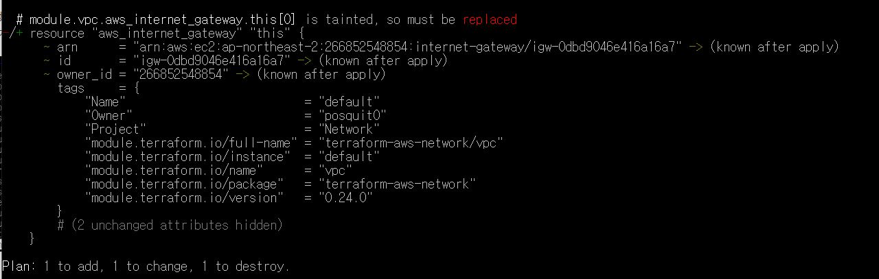 그럼 terraform taint "module.vpc.aws_internet_gateway.this[0]" 명령어를 통해 해당 리소스를 비정상으로 표시가 된다,
