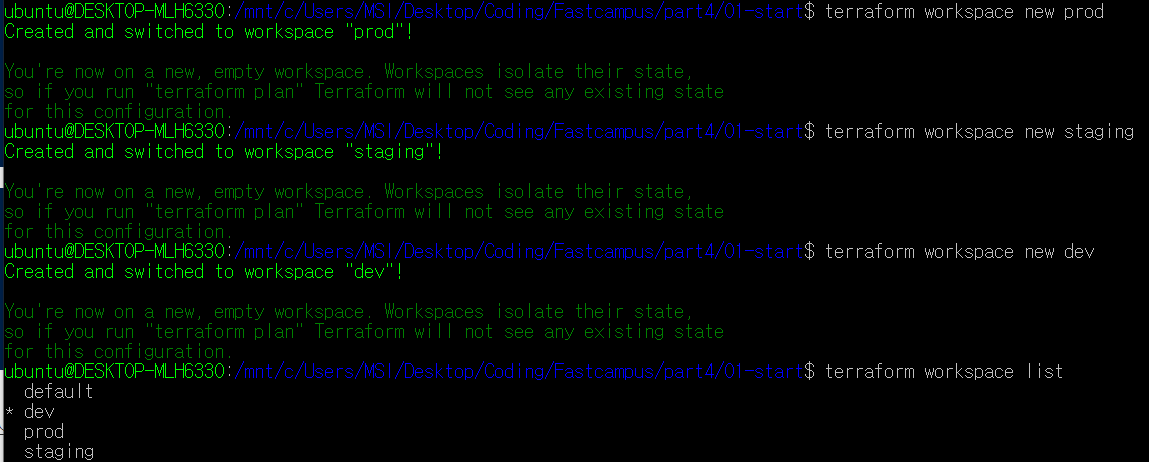 그리고 dev, prod, staging 워크스페이스를 생성한다.