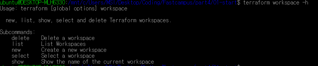 terraform workspace 관련 명령어로는 terraform workspace -h를 치면 서브 명령어들이 나온다.