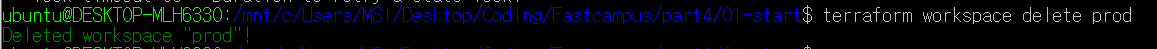 terraform workspace delete [워크스페이스 이름] 명령어는 워크스페이스를 제거할 수 있다.