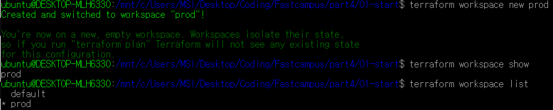 terraform workspace new [워크스페이스 이름] 명령어는 새로운 워크스페이스를 생성한다. 워크스페이스를 새로 생성하면 자동으로 새 워크스페이스로 현재 프로젝트 설정이 바뀐다.