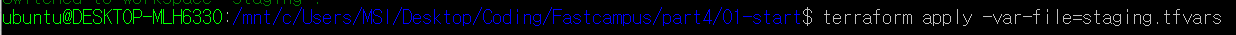 다시 staging 워크스페이스를 선택하고 terraform apply -var-file=staging.tfvars 명령어를 입력해보자