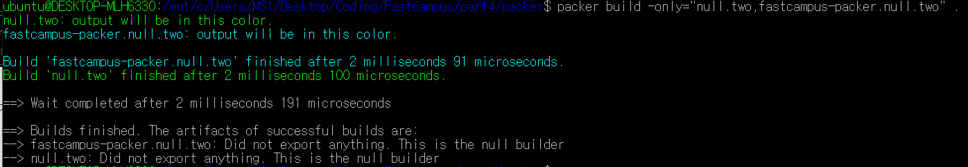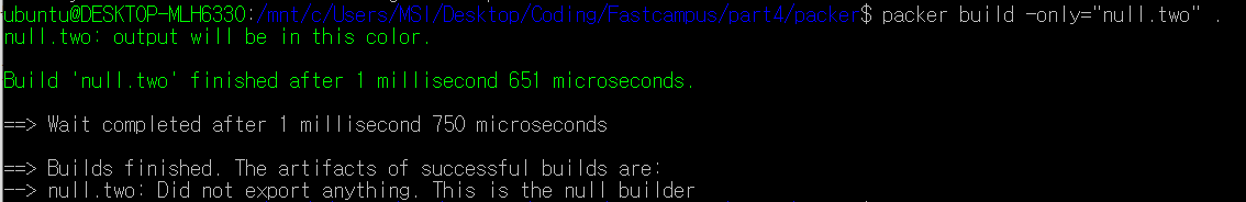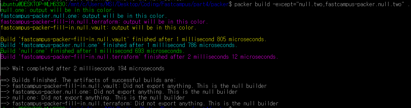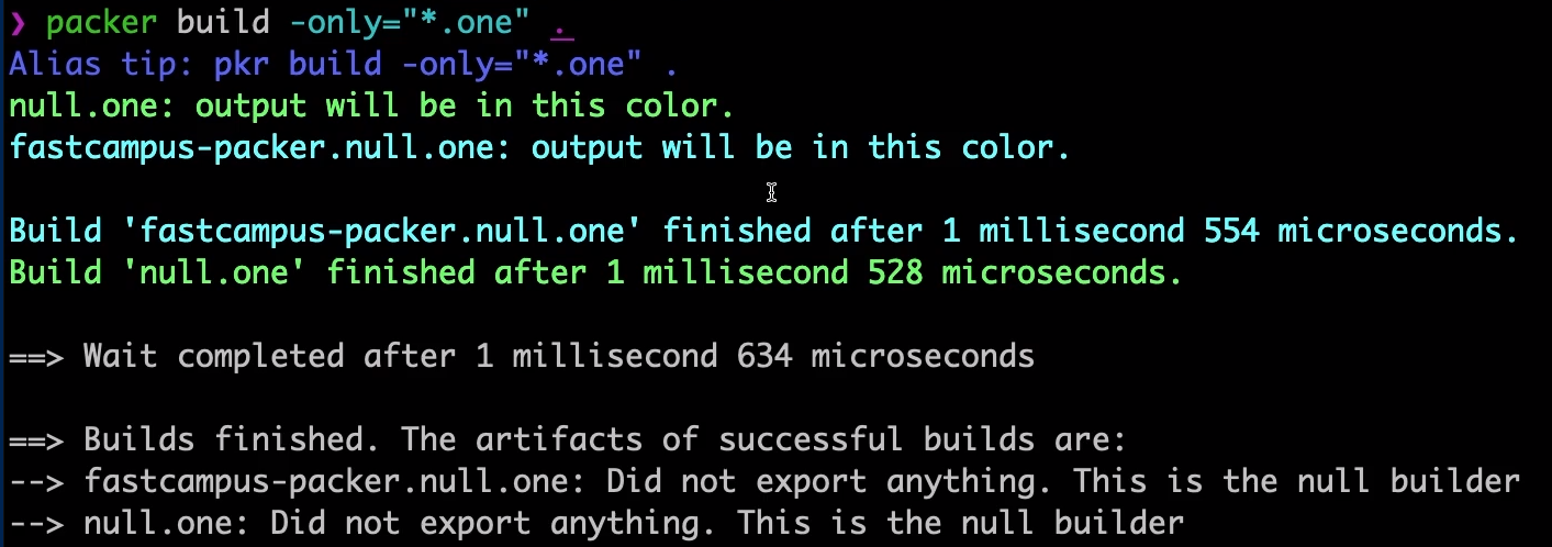 packer build -except="[실행할 source 이름]" [디렉토리 위치] 명령어를 입력하면 원하는 소스만 제외하고 실행할 수 있다. 또한 한가지 빌드 프로세스를 더 제외하고 실행하고 싶으면 , 로 추가하면 된다.