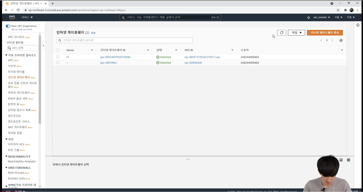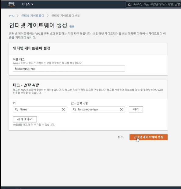 인터넷 게이트웨이 대시보드에서 인터넷 게이트웨이 생성 버튼을 누르자