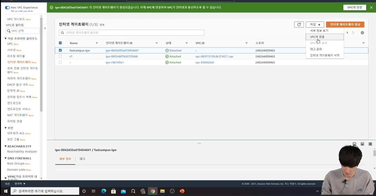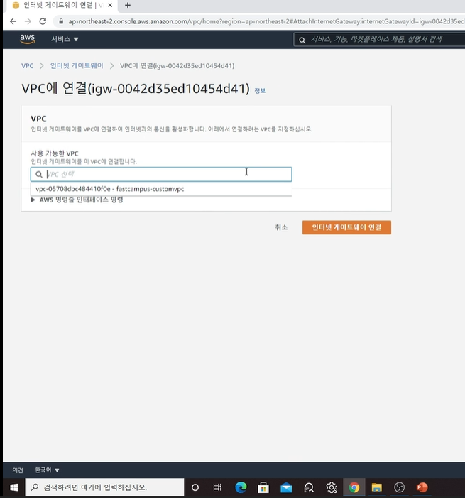 fastcampus-customvpc를 고르고 인터넷 게이트웨이 연결 버튼을 누르자