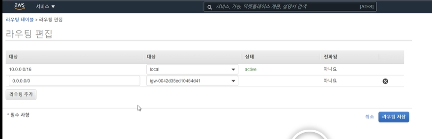 이를 허용하기위해 0.0.0.0/0을 넣고 대상은 만들어 놓은 인터넷 게이트웨이를 적는다.