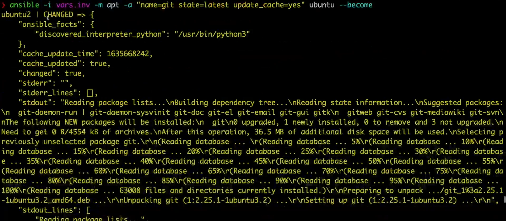 세 번째 예로 이번에는 vars.inv에 있는 ubuntu 그룹에 한해서 apt 모듈을 이용해서 git을 최신 버전으로 다운로드하는 명령어를 보자