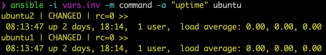 두 번째 예로는 ansible ubuntu -m command -a "uptime" -i vars.inv 명령어가 있다.