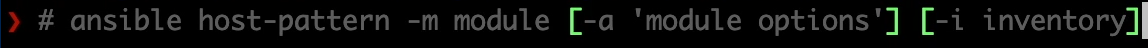 ansible host-pattern -m module [-a 'module options'] [-i inventory]