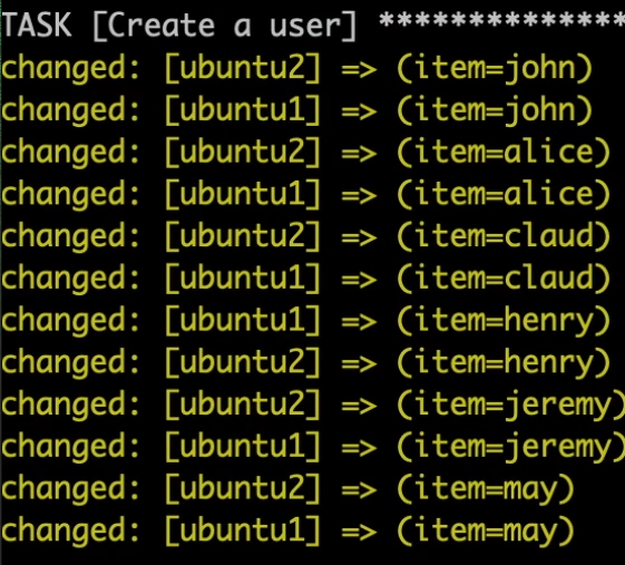 플레이북을 실행해보면 ubuntu1, 2에 대해 item이 루프에 의해 잘 바뀌는 걸 볼 수 있다.