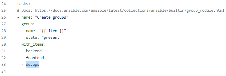 state: "present"를 통해 생성한다는 의미를 부여했고 name에는 진자템플릿을 이용해서 "item"이라는 키워드를 사용했다.