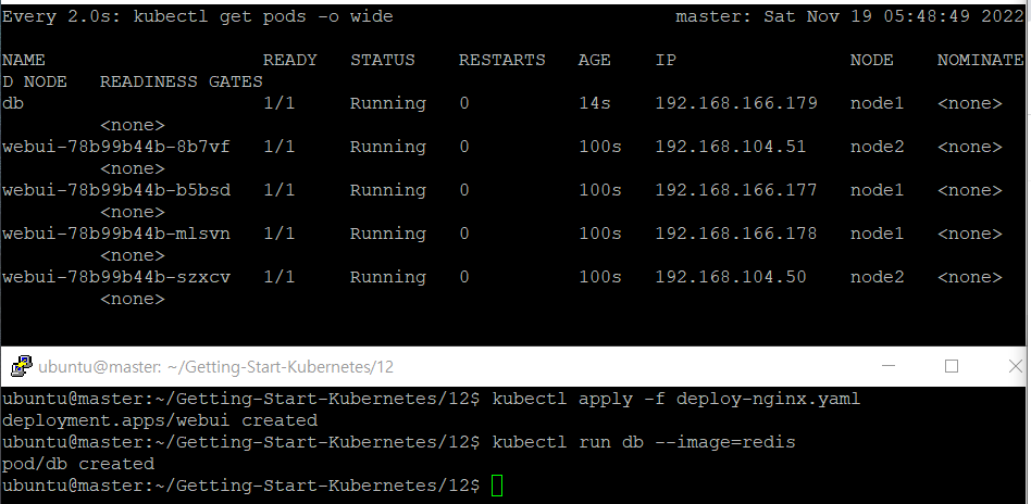 kubectl apply -f deploy-nginx.yaml로 실행해보면 노드2 뿐만 아니라 노드1에도 파드가 잘 실행된다.